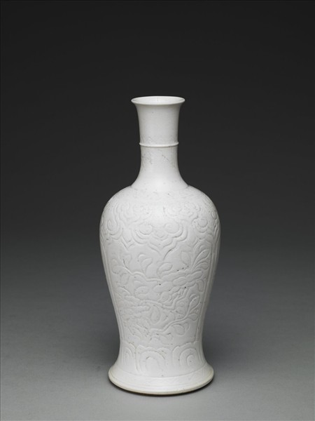 小撇口,細長頸,垂肩,直腹下斂,足脛外撇,矮圈足。通體施白柚,釉色乳白,如奶油而渾厚。頸凸飾一道弦紋,弦紋上淺刻三角連紋,近肩處環繞帶狀卷渦紋,其下刻劃上下相間的如意雲頭紋,器身分四部分刻劃四季花卉,近足處劃飾變形蓮瓣紋,足部一圈飾三角連紋。