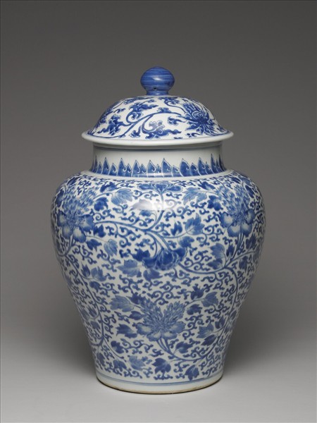 此類蓋罐因蓋頂加飾寶珠鈕,使得整個器蓋的形狀像極了將軍佩戴的盔帽,因而有將軍罐之名。將軍罐自十七世紀以後屢有生產,同時也傳銷至西方,成為王侯貴族居家擺放的精緻陳設器組件中的一種樣式。如神聖羅馬帝國薩克森選帝侯和波蘭王奧古斯都二世(Augustus II the Strong, 1670-1733)即珍藏多組由將軍罐和觚型花瓶配組而成的陳設器組,其中尺寸碩大者,亦有超過一米以上。2005年發現的平潭碗礁一號沈船也出土至少三種不同樣式的將軍罐,其中大件者通高亦達五十公分左右。此品高度類似碗礁一號出土品,器表除頸部環飾一圈長短葉形圖案外,自肩部至底部,在上下雙青線內滿繪纏枝花卉,花朵具寫實樣態特色,此一紋樣因也見於德勒斯登藏品之列,在該品同時裝飾出康熙朝典型的仕女紋樣以及1721年前已入藏登錄有案下,而可回頭結合碗礁一號出土品1690年的生產下限,類推此品燒製於康熙朝。另外,此品之蓋與身其實裝飾不同紋樣,特別是從和器蓋雷同的纏枝番蓮紋因見於傳世另外幾件蓋罐,而讓人懷疑目前所見器蓋當非原蓋。(引自《亞洲探險記:十七世紀東西交流傳奇》)