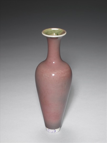 瓶撇口,細長頸,豐肩,瘦底,圈足。通體施紅釉,口沿顯露白色胎骨,足部露胎,足內施白釉,有青花「大清康熙年製」二行六字楷書款。