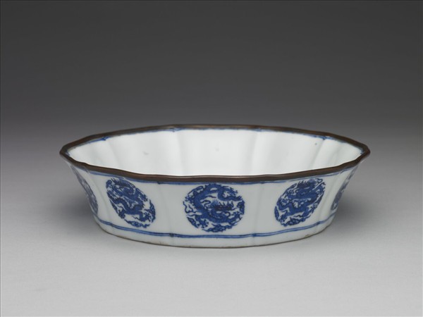 牡丹式洗。十瓣花口,器壁凹凸隨形,侈口,淺壁,內底心微拱,外底略凹,淺圈足。口緣金屬釦。器外壁等距繪飾團龍紋十組。器內底飾一龍飛舞雲間,外加雙青線。足緣露胎一圈,器底外雙青圈內青花書「大明宣德年製」二行六字楷款。本器鈷藍釉發色勻且亮。