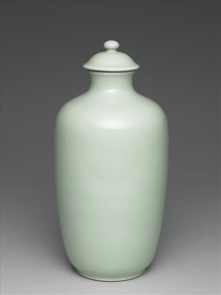 小圓口,束頸,豐肩,深壁直下,器身呈圓筒狀,圈足,帶圓鈕蓋。通體均施仿汝釉,呈粉青色,釉色勻淨淡雅,胎骨勻細。底青花書「大清雍正年製」六字雙行雙圓框楷款。