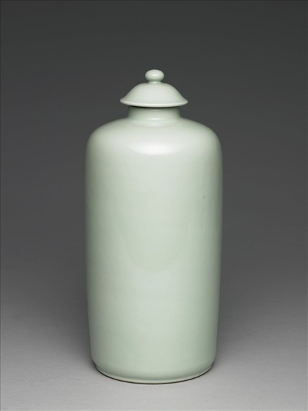 小圓口,束頸,豐肩,深壁直下,器身呈圓筒狀,圈足,帶圓鈕蓋。通體均施仿汝釉,呈粉青色,釉色勻淨淡雅,胎骨勻細。底青花書「大清雍正年製」六字雙行雙圓框楷款。
