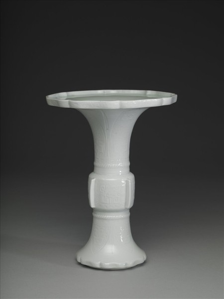 仿古銅觚式,撇口豎沿,長頸,鼓腹,長脛外撇,圈足。全器施白釉,印花為飾。腹部有四出戟,之間飾螭紋,下襯雷紋錦,上下各飾一道如意雲紋;頸及脛有蕉葉紋開光,內飾雷紋錦地變形獸面紋,接近腹側有一道絞絲紋;口沿內外及底緣皆作海棠形,並飾一圈回紋。足底緣無釉露胎呈褐色,底施白釉,有模印「大清雍正年製」雙行六字楷款,外加雙圈。