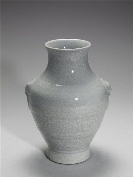 侈口短頸,豐肩下斂,撇足,器肩兩側貼飾獸首銜環暗耳。頸肩交界處雙弦紋一周,腹外壁等距雙弦紋兩圈,全器罩施青釉,色澤仿自北宋汝窯,釉質凝潤並有狹長開片,釉薄處略見胎色。圈足露胎褐色汁,足內亦施青釉,書青花「大清雍正年製」三行六字篆款。