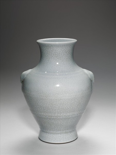 侈口短頸,豐肩下斂,撇足,器肩兩側貼飾獸首銜環暗耳。頸肩交界處雙弦紋一周,腹外壁等距雙弦紋兩圈,全器罩施青釉,色澤仿自北宋汝窯,釉質凝潤並有細碎開片,釉薄處略見胎色。圈足露胎褐色汁,足內亦施青釉,書青花「大清雍正年製」三行六字篆款。
