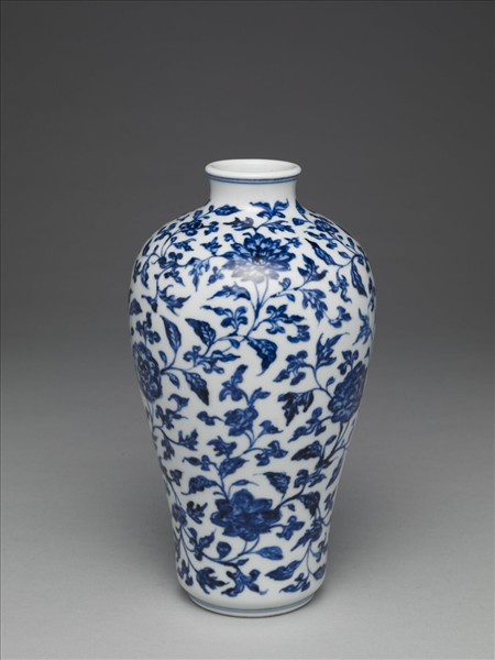 白地青花瓷蓋罐,直唇口,短頸,豐肩,腹上豐下斂,平底,淺圈足,帶圓鈕笠形子母口蓋。全器以青花描繪紋樣,器身滿飾纏枝花卉紋;蓋面繪纏枝蓮紋,蓋鈕飾六瓣花紋。底青花書「大清雍正年製」六字雙行雙圓框楷款。