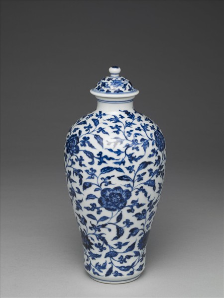 青花瓷蓋罐,直唇口,短頸,豐肩,腹上豐下斂,平底,淺圈足,帶圓鈕笠形子母口蓋。全器以青花描繪紋樣,器身滿飾纏枝蓮紋;蓋面繪纏枝蓮紋,蓋鈕飾六瓣花紋。底青花書「大清雍正年製」六字雙行雙圓框楷款。