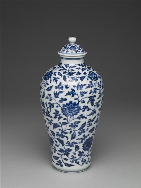 青花瓷蓋罐,直唇口,短頸,豐肩,腹上豐下斂,平底,淺圈足,帶圓鈕笠形子母口蓋。全器以青花描繪紋樣,器身滿飾纏枝蓮紋;蓋面繪纏枝蓮紋,蓋鈕飾六瓣花紋。底青花書「大清雍正年製」六字雙行雙圓框楷款。