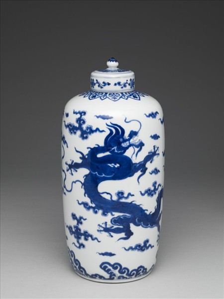 青花瓷蓋罐,小圓口,短直頸,豐肩,深壁直下,器身呈圓筒狀,淺凹足,帶圓鈕拱形蓋。全器以青花描繪紋飾,肩部飾仰覆蓮瓣紋一周,腹部繪夔龍一對,隙地飾以十字雲紋及捲雲紋,底邊飾波濤紋;蓋鈕飾朵花紋,蓋面繪蓮瓣紋,蓋壁飾六瓣花紋。足底露胎,足內施白釉,有青花書「大清雍正年製」六字雙行雙圓框楷款。