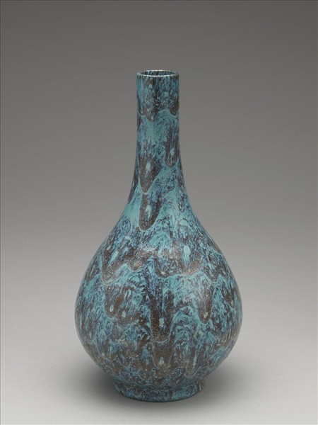 直口膽瓶,小口,細長頸,梨形腹,圈足。全器施爐鈞釉,深青、淺青、乳濁狀互為交匯,流淌交融。圈足底緣塗護胎汁,呈黑褐色,底印「雍正年製」四字雙行方形篆款。