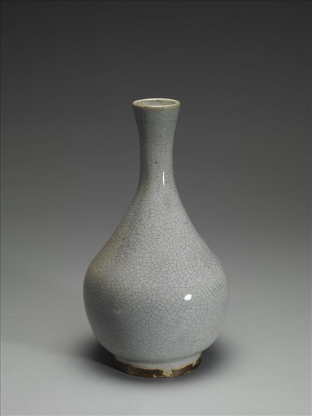 玉壺春式瓶,小圓口微侈,細長頸,中央收束,斜肩,碩圓腹下段微斂,圈足。全器施米色泛灰青釉,釉面滿佈細密網狀開片紋。足沿平直,底與足端及足外壁均無釉,塗有醬色汁。舊稱「廣窯」作品。