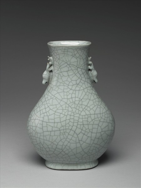 扁壺,自口至底均扁身。口橢圓,微侈,長頸,斜肩,碩腹下斂,橢長形圈足,頸部貼飾雙鹿首。全器仿哥窯灰青釉,密佈深色清晰的細開片裂紋。圈足底緣塗護胎汁,呈黑褐色。外底書「大清乾隆年製」六字三行青花篆款。