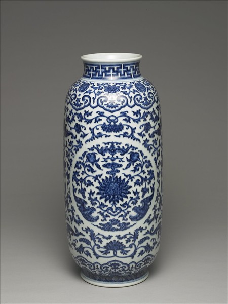 口微撇,直短頸,筒形長腹,圈足。以青花為飾,腹中央有二圓形開光,開光內繪如意番蓮紋,周圍圍繞蝙蝠、桃實、鳥及朵雲;開光旁滿繪纏枝如意番蓮紋,瓶身兩側有蝙蝠銜磬紋,上下繪如意雲紋一圈、番蓮與壽字紋。頸部飾卍字不斷紋,圈足飾回紋。足底緣露胎成褐色,底中央以青花書「大清乾隆年製」六字三行篆款。