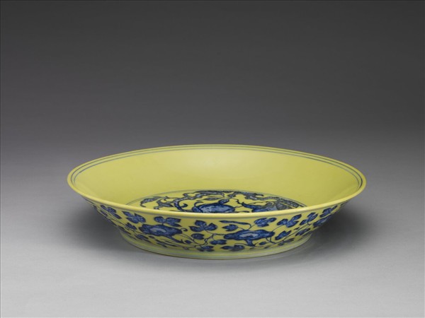 盤,敞口,淺壁下斂,平底,圈足。全器以釉青花繪飾圖樣,留白處均滿施黃釉,呈現黃底藍花的視覺印象。其器外壁飾轉枝牽牛花花葉,盤內底繪折枝桃樹枝,樹梢桃實纍纍。底外滿施黃釉,中央白地青花書「大清乾隆年製」三行六字楷款。這種黃地藍花器的製作,其實從明代而來;器上的鈷藍紋飾,也刻意加繪深藍點以模仿明代青花發色不勻的特色。