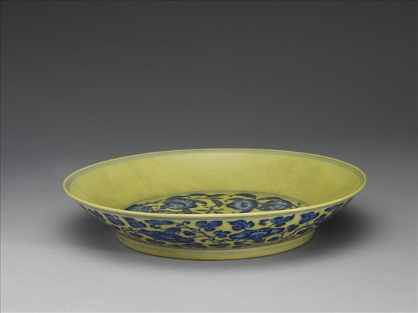 盤,敞口,淺壁下斂,平底,圈足。全器以釉青花繪飾圖樣,留白處均滿施黃釉,呈現黃底藍花的視覺印象。其器外壁飾轉枝牽牛花花葉,盤內底繪折枝桃樹枝,樹梢桃實纍纍。底外滿施黃釉,中央白地青花書「大清乾隆年製」三行六字楷款。這種黃地藍花器的製作,其實從明代而來;器上的鈷藍紋飾,也刻意加繪深藍點以模仿明代青花發色不勻的特色。