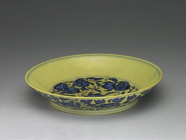 盤,敞口,淺壁下斂,平底,圈足。全器以釉青花繪飾圖樣,留白處均滿施黃釉,呈現黃底藍花的視覺印象。其器外壁飾轉枝牽牛花花葉,盤內底繪折枝桃樹枝,樹梢桃實纍纍。底外滿施黃釉,中央白地青花書「大清乾隆年製」三行六字楷款。這種黃地藍花器的製作,其實從明代而來;器上的鈷藍紋飾,也刻意加繪深藍點以模仿明代青花發色不勻的特色。