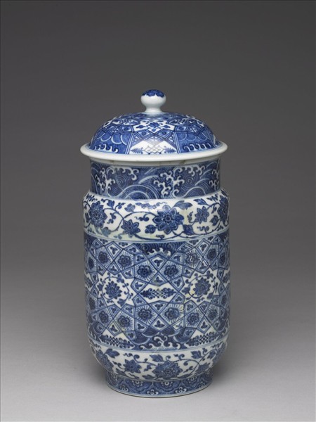帶蓋白地青花瓷罐,圓口,直頸,折肩,肩甚窄,直腹如筒,圈足。頸部波濤紋。外壁上下各飾一帶纏枝花卉,中央部分等距裝飾數個角星,角星之中繪卷枝花,並將角星外廓直線分別延長,彼此交錯分割出各式幾何區塊,並於幾何區塊中各自填飾大小花卉、葉片、波濤紋。足牆繪飾半邊盛開花朵,其順次排列如覆蓮瓣。蓋外壁裝飾概念與外壁類同,都是以中心向外分割輻出各式幾何形區塊,並以花卉、波濤填飾其中。由其器形與紋樣看來,顯然是模仿自明代初年的青花瓷器(現藏於北京故宮,品名為〈青花錦紋壯罐〉)。學者曾進一步論及這種器形的來源,推定源頭可以追溯至伊斯蘭陶瓷。除此之外,若將其外壁主紋飾與十四世紀敘利亞馬木路克王朝時期〈玻璃金彩唾壺〉外壁紋飾相較,就會發現其裝飾概念類同,特別是〈玻璃金彩唾壺〉幾何區塊中填飾的如花似葉的小紋樣,同見於本器與北京故宮藏品。如此一來,我們就可以瞭解本器樣式、紋飾所模仿的對象與源流,實是明代初年受外國影響所製作的作品。本器雖然無款,但是院藏中見有帶「大清乾隆年製」款的類似作品(典藏號:中瓷5493),且紋飾、釉色高度相似,或可推定本器當製作於清代乾隆朝。