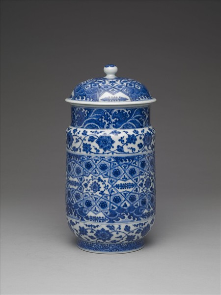 帶蓋白地青花瓷罐,圓口,直頸,折肩,肩甚窄,直腹如筒,圈足。頸部波濤紋。外壁上下各飾一帶纏枝花卉,中央部分等距裝飾數個角星,角星之中繪卷枝花,並將角星外廓直線分別延長,彼此交錯分割出各式幾何區塊,並於幾何區塊中各自填飾大小花卉、葉片、波濤紋。足牆繪飾半邊盛開花朵,其順次排列如覆蓮瓣。蓋外壁裝飾概念與外壁類同,都是以中心向外分割輻出各式幾何形區塊,並以花卉、波濤填飾其中。由其器形與紋樣看來,顯然是模仿自明代初年的青花瓷器(現藏於北京故宮,品名為〈青花錦紋壯罐〉)。學者曾進一步論及這種器形的來源,推定源頭可以追溯至伊斯蘭陶瓷。除此之外,若將其外壁主紋飾與十四世紀敘利亞馬木路克王朝時期〈玻璃金彩唾壺〉外壁紋飾相較,就會發現其裝飾概念類同,特別是〈玻璃金彩唾壺〉幾何區塊中填飾的如花似葉的小紋樣,同見於本器與北京故宮藏品。如此一來,我們就可以瞭解本器樣式、紋飾所模仿的對象與源流,實是明代初年受外國影響所製作的作品。本器雖然無款,但是院藏中見有帶「大清乾隆年製」款的類似作品(典藏號:中瓷5493),且紋飾、釉色高度相似,或可推定本器當製作於清代乾隆朝。
