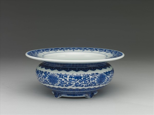 廣口折沿,束頸,折肩,短鼓腹下斂,圈足加飾四只如意雲形板足,一足殘。折沿上繪有卷草紋與蓮紋為飾,頸畫連續回紋一道,肩畫雲頭如意紋一周,腹外壁繪轉枝番蓮紋。近底邊畫蕉葉紋及卷草紋一周,間飾青線二道。足底露白胎,圈足間共有八個支釘痕。盆底有二圓孔,中央有青花書「大清乾隆年製」六字雙行篆款。