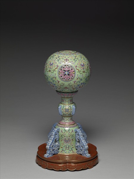 瓷冠架,上為圓球狀的器身,下為承座。器身圓頂便於放置冠、帽,頂上有一片小圓蓋可以打開,裝入各式香花或香粉,香氣自器壁鏤空處散出以薰香帽子、頭冠,底部有一插銷,插入承座可使球體轉動;兼具置物、花薰及裝飾功能。全器草綠色地,繪各色轉枝番蓮花紋,蓋繪朵花紋及如意點,器身中段分列四個圓形開光,內飾鏤空粉紅色番蓮花紋;承座頂為圓盤狀,以承接器身,外繪蓮瓣紋,中段飾各色朵花紋,中央有四出脊,下方飾番蓮紋,有四白地描青雲夔脊座與底盤相連;底盤為海棠形,磚紅地繪金彩番蓮紋,側邊繪卷草紋、朵花紋等紋飾,四如意雲足,底部中央金書「大清乾隆年製」六字三行篆款。