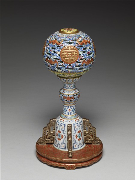 瓷冠架,上為圓球狀的器身,下為承座。器身圓頂便於放置冠、帽,頂上有一片小圓蓋可以打開,裝入各式香花或香粉,香氣自器壁鏤空處散出以薰香帽子、頭冠,兼具置物、花薰及裝飾功能。以彩釉繪製圖案,全器飾鏤空青花五彩雲蝠紋,分列四紅底金彩萬壽團花紋開光,上緣飾如意雲紋,下緣繪黃地五彩番蓮紋,有祥瑞福壽之意,蓋飾朵花紋;承座頂為圓盤狀,以承接器身,外繪蓮瓣紋,中段飾藍色朵花紋及雲蝠紋,下方飾朵花紋,有四雲夔脊棱與底盤相連;底盤為海棠形,磚紅地繪金彩番蓮紋,側邊繪卷草紋、朵花紋等紋飾,四如意雲足。底中央有金書「大清乾隆年製」六字三行篆款。
