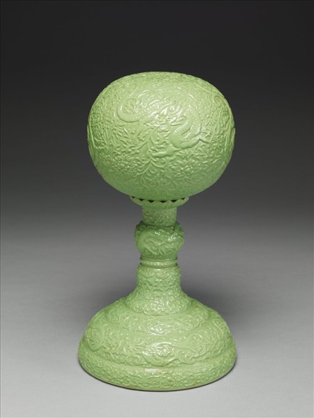 瓷冠架,上為圓球狀的器身,下為承座,器身圓頂便於放置冠、帽。整體施綠彩,浮雕纏枝番蓮紋錦地雲龍紋,承座頂為圓盤狀,以承接器身,刻飾蓮瓣紋,中段間飾如意雲紋與朵花紋,底座做三層階梯狀,最下層僅有番蓮紋。底內凹入,圈足底露胎。
