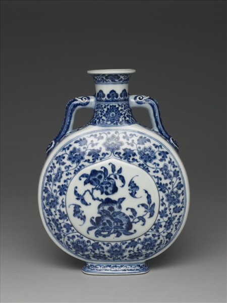 扁壺,唇口外撇,短直頸,扁圓腹,兩側如意耳連接頸肩,方足外撇。整器以青花繪飾卷枝花、如意雲頭、纏枝番蓮花。腹外壁中央微凸,飾桃形開光,內繪折枝桃實與蝙蝠,帶有「福壽」的吉祥寓意。開光外滿飾纏枝番蓮花,足牆飾卷草。鈷藍釉料凝滯成塊,並刻意點藍斑,營造鐵銹斑的樣貌,這種效果應是想追仿明永樂、宣德時期青花釉料特色。底足露胎一圈,足內白釉地青花書「大清乾隆年製」三行六字篆款。