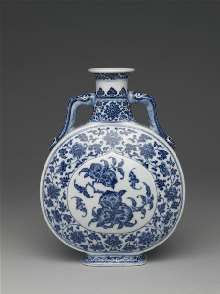 扁壺,唇口外撇,短直頸,扁圓腹,兩側如意耳連接頸肩,方足外撇。整器以青花繪飾卷枝花、如意雲頭、纏枝番蓮花。腹外壁中央微凸,飾桃形開光,內繪折枝桃實與蝙蝠,帶有「福壽」的吉祥寓意。開光外滿飾纏枝番蓮花,足牆飾卷草。鈷藍釉料凝滯成塊,並刻意點藍斑,營造鐵銹斑的樣貌,這種效果應是想追仿明永樂、宣德時期青花釉料特色。底足露胎一圈,足內白釉地青花書「大清乾隆年製」三行六字篆款。