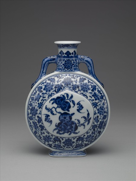扁壺,唇口外撇,短直頸,扁圓腹,兩側如意耳連接頸肩,方足外撇。整器以青花繪飾卷枝花、如意雲頭、纏枝番蓮花。腹外壁中央微凸,飾桃形開光,內繪折枝桃實與蝙蝠,帶有「福壽」的吉祥寓意。開光外滿飾纏枝番蓮花,足牆飾卷草。鈷藍釉料凝滯成塊,並刻意點藍斑,營造鐵銹斑的樣貌,這種效果應是想追仿明永樂、宣德時期青花釉料特色。底足露胎一圈,足內白釉地青花書「大清乾隆年製」三行六字篆款。