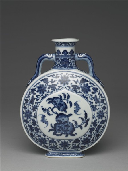 扁壺,唇口外撇,短直頸,扁圓腹,兩側如意耳連接頸肩,方足外撇。整器以青花繪飾卷枝花、如意雲頭、纏枝番蓮花。腹外壁中央微凸,飾桃形開光,內繪折枝桃實與蝙蝠,帶有「福壽」的吉祥寓意。開光外滿飾纏枝番蓮花,足牆飾卷草。鈷藍釉料凝滯成塊,並刻意點藍斑,營造鐵銹斑的樣貌,這種效果應是想追仿明永樂、宣德時期青花釉料特色。底足露胎一圈,足內白釉地青花書「大清乾隆年製」三行六字篆款。