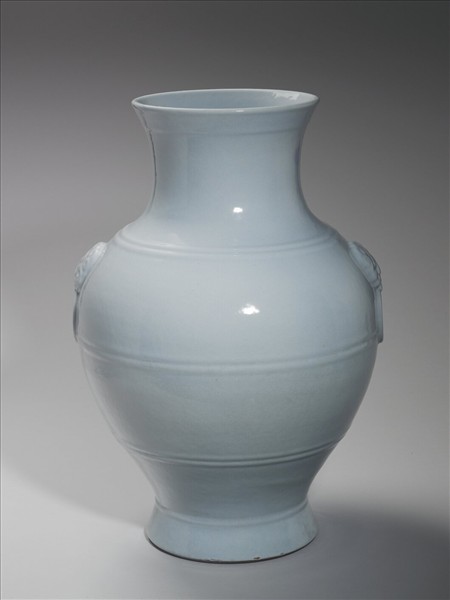侈口,直頸,碩腹下斂,圈足外撇,肩部兩側鋪首啣環暗耳。整器施罩青釉,呈淡天青色。外壁光素無紋,僅在頸肩交界處、腹外壁、腹足交界處飾有凸起之弦紋。圈足露胎一圈塗深褐色汁,足內滿釉並以鈷藍釉書「大清乾隆年製」三行六字篆款。
