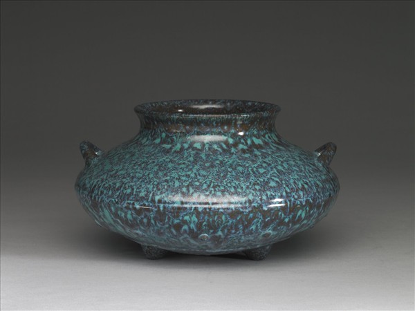 微侈口,短頸,折肩,雙立耳,斂腹,三乳足。通體施爐鈞釉,呈靛藍、天藍等多色深淺混雜流動窯變釉。足底塗護胎汁,呈黑色,底心印「大清乾隆年製」六字三行篆款。仿鈞窯變釉為雍正時出現的新品種,係仿鈞釉色繁衍而來,採多次施釉,燒製過程中,不同金屬元素自然結合所產生的流動窯變釉色。