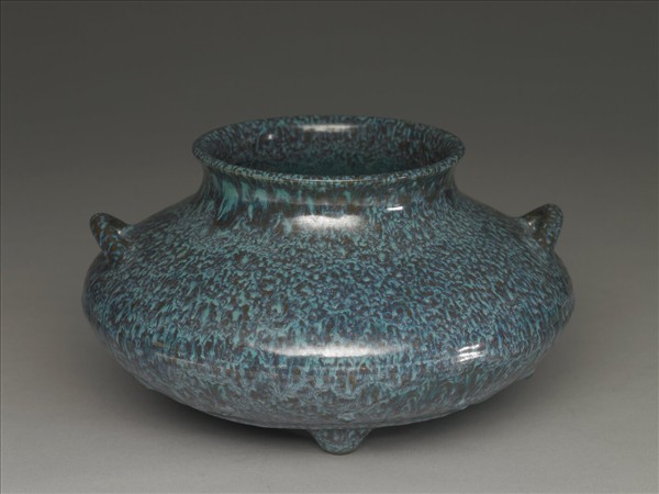 微侈口,短頸,折肩,雙立耳,斂腹,三乳足。通體施爐鈞釉,呈靛藍、天藍等多色深淺混雜流動窯變釉。足底塗護胎汁,呈黑色,底心印「大清乾隆年製」六字三行篆款。仿鈞窯變釉為雍正時出現的新品種,係仿鈞釉色繁衍而來,採多次施釉,燒製過程中,不同金屬元素自然結合所產生的流動窯變釉色。