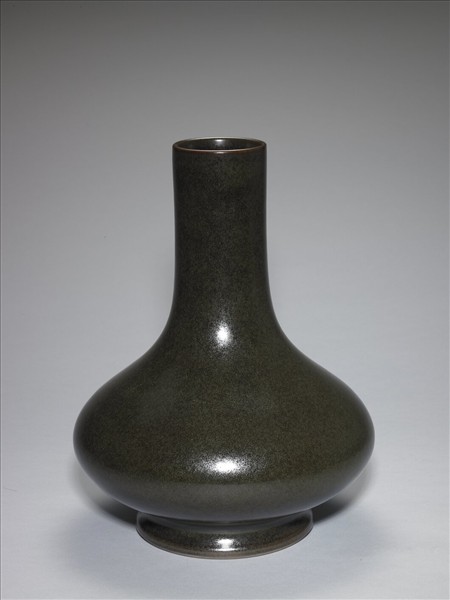 圓口,長直頸,碩腹,圈足外撇。外壁滿施茶葉末釉,呈色濃綠。足緣露胎一圈,足內滿釉,中心釉下印「大清乾隆年製」三行六字篆款。所謂茶葉末釉,是一種高溫色釉,其呈色往往綠黃交融,這與唐英〈陶成紀事碑記〉中對「廠官釉」的描述有:「鱔魚黃」、「蛇皮綠」等描述似可對合,所以研究者也將這種釉名為「廠官釉」。