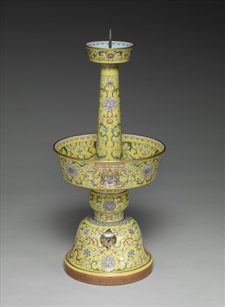 燭臺,分上、下兩承盤,有承柱相連。底座為覆鐘式。明顯可見下盤與座子之間有接縫。兩部分是分開燒窯,而後連接起來。連接的方式為子母卡榫式,也就是說座子挖孔,下盤的承軸附裝凸榫,套裝之前以低溫燒結的混合物塗抹,以使黏住永不復脫落。全器塗黃地,上繪卷枝番蓮、如意勾雲紋花邊、及佛教八寶。下盤的外壁有描紅篆款「大清乾隆年製」。款識下飾佛教八寶之一的華蓋,依次是魚、瓶、花。覆鐘式的座子上為法輪、螺、盤長及傘。此外加飾如意雲頭、回紋等。