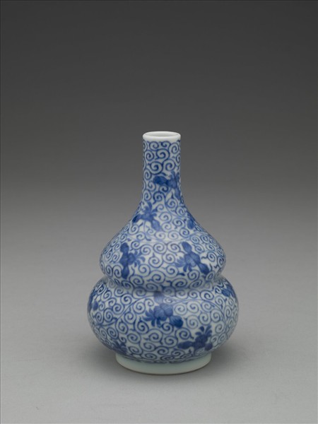 直口,細頸,斜肩,垂腹,圈足;上腹部有一道凹棱,使瓶身略呈葫蘆形。外壁以青花滿繪捲雲紋地,纏枝花盤旋其間。足底緣露胎呈白色,底以青花書「大清雍正年製」雙行六字楷款,外加雙圈。