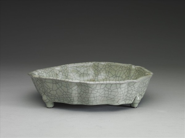 葵瓣形八邊形洗,敞口,圓唇棱,淺壁,壁下緣收為平底,底邊有棱,三獸足。全器施哥釉,釉色晶瑩潤澤,釉面佈滿黑、褐色開片紋。底有八個支釘痕圍成一圈,支釘痕及足底露胎,呈鐵黑色。