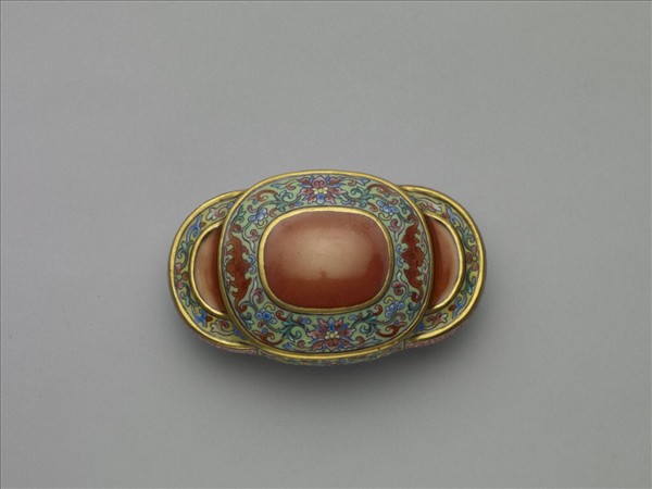 瓷帶扣,形如扁圓形板狀物疊於長橢圓形板狀物上。上半部分的扁圓形板狀物面上描金邊框,面上中央復以金彩描一近橢圓形框,框內滿飾橘紅彩,猶如色調沉潤的寶石,框外兩金彩框線間淺綠地,上下番蓮花葉,兩側紅色蝙蝠。下半部橢圓形瓷板的部分,其裝飾樣式與上半部相同,皆是模仿橘紅色寶石圍飾帶狀飾,只是下半部的帶狀飾為黃地捲草花葉紋。另面滿施湖綠釉。見有支釘痕,並凸起雙鈕,用以扣合、固定。整體裝飾甚為富麗。