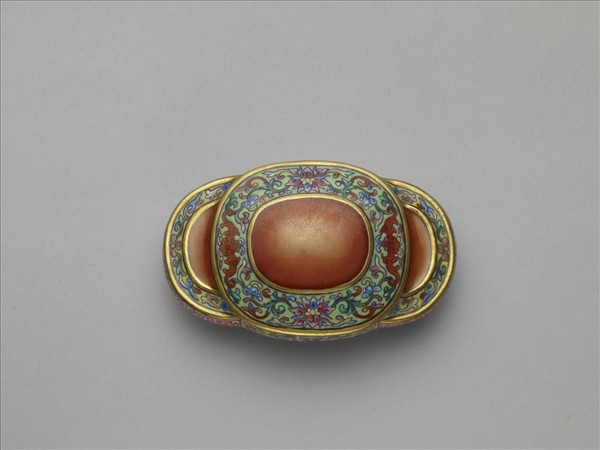 瓷帶扣,形如扁圓形板狀物疊於長橢圓形板狀物上。上半部分的扁圓形板狀物面上描金邊框,面上中央復以金彩描一近橢圓形框,框內滿飾橘紅彩,猶如色調沉潤的寶石,框外兩金彩框線間淺綠地,上下番蓮花葉,兩側紅色蝙蝠。下半部橢圓形瓷板的部分,其裝飾樣式與上半部相同,皆是模仿橘紅色寶石圍飾帶狀飾,只是下半部的帶狀飾為黃地捲草花葉紋。另面滿施湖綠釉。見有支釘痕,並凸起雙鈕,用以扣合、固定。整體裝飾甚為富麗。