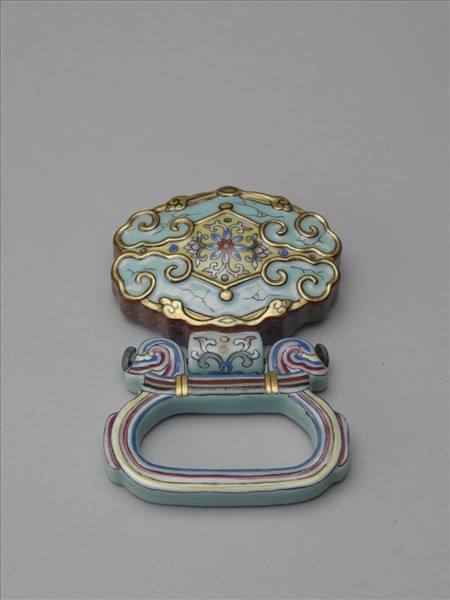 瓷帶板,近菱形,由面上繪飾圖樣看來,似乎是模仿兩件夾角較大的如意雲頭玉磬,並置相接於黃地面上,而圍成近菱形的外貌。模仿玉磬部分滿施湖綠釉,並以金彩描邊,且湖綠釉部分以黑彩描小裂痕,頗具趣味。至於兩磬所圍出的中央部分,則繪飾黃地捲草花葉。帶板另面內凹,滿施湖綠釉,上有兩長條形瓷帶平行架跨該面,瓷帶上見有支釘痕。瓷帶板一側帶中空瓷管,管外壁湖綠地花葉。金屬長螺帽穿亙瓷管,接連、固定一近橢圓形瓷環。瓷環滿飾湖綠釉,面上以紅色、黃色、藍色繪飾,使瓷環有如多色絲繩綁袱、曲為橢圓之貌。這些裝飾,其瓷環造型裝飾取法多色絲繩,更添其仿金邊玉磬效果帶板的富麗之氣。