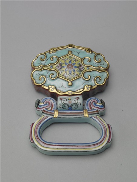 瓷帶板,近菱形,由面上繪飾圖樣看來,似乎是模仿兩件夾角較大的如意雲頭玉磬,並置相接於黃地面上,而圍成近菱形的外貌。模仿玉磬部分滿施湖綠釉,並以金彩描邊,且湖綠釉部分以黑彩描小裂痕,頗具趣味。至於兩磬所圍出的中央部分,則繪飾黃地捲草花葉。帶板另面內凹,滿施湖綠釉,上有兩長條形瓷帶平行架跨該面,瓷帶上見有支釘痕。瓷帶板一側帶中空瓷管,管外壁湖綠地花葉。金屬長螺帽穿亙瓷管,接連、固定一近橢圓形瓷環。瓷環滿飾湖綠釉,面上以紅色、黃色、藍色繪飾,使瓷環有如多色絲繩綁袱、曲為橢圓之貌。這些裝飾,其瓷環造型裝飾取法多色絲繩,更添其仿金邊玉磬效果帶板的富麗之氣。