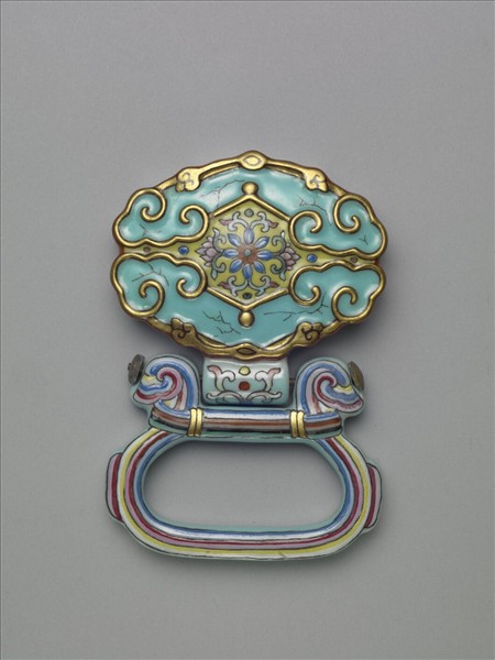 瓷帶板,近菱形,由面上繪飾圖樣看來,似乎是模仿兩件夾角較大的如意雲頭玉磬,並置相接於黃地面上,而圍成近菱形的外貌。模仿玉磬部分滿施湖綠釉,並以金彩描邊,且湖綠釉部分以黑彩描小裂痕,頗具趣味。至於兩磬所圍出的中央部分,則繪飾黃地捲草花葉。帶板另面內凹,滿施湖綠釉,上有兩長條形瓷帶平行架跨該面,瓷帶上見有支釘痕。瓷帶板一側帶中空瓷管,管外壁湖綠地花葉。金屬長螺帽穿亙瓷管,接連、固定一近橢圓形瓷環。瓷環滿飾湖綠釉,面上以紅色、黃色、藍色繪飾,使瓷環有如多色絲繩綁袱、曲為橢圓之貌。這些裝飾,其瓷環造型裝飾取法多色絲繩,更添其仿金邊玉磬效果帶板的富麗之氣。