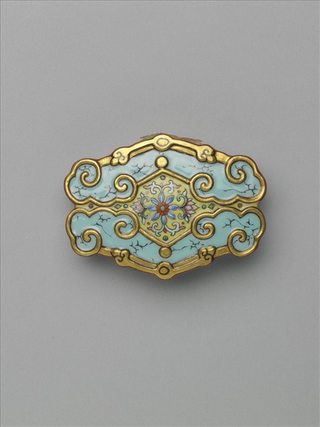 瓷製帶板,近菱形,由兩如意雲頭形磬組合而成。磬形圖案周邊起棱凸出,塗金彩;內施淺藍釉為地,並以黑彩描小裂痕,仿松綠石紋理。兩磬中央之開光為淺黃地,中央描繪花葉紋。帶頭側邊為紅地,表面描繪銀色花葉紋。器背施淺藍色釉,帶圓形與橢圓形鈕各一,光素無紋。