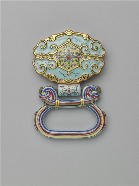 瓷製帶板,近菱形,由兩如意雲頭形磬組合而成。磬形圖案周邊塗金彩,內施淺藍釉為地,並以黑彩描小裂痕。兩磬中間之開光為淺黃地,中央描繪花葉紋。帶板一側接一中空長管,以橫貫而過的金屬長釘連接一橢圓瓷環。環身表面滿繪紅、黃、藍各色條紋。帶板背面略凹陷,中央帶一長方框,全器背面光素無紋。