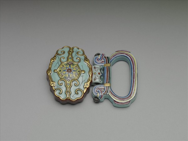 瓷製帶板,近菱形,由兩如意雲頭形磬組合而成。磬形圖案周邊塗金彩,內施淺藍釉為地,並以黑彩描小裂痕。兩磬中間之開光為淺黃地,中央描繪花葉紋。帶板一側接一中空長管,以橫貫而過的金屬長釘連接一橢圓瓷環。環身表面滿繪紅、黃、藍各色條紋。帶板側邊為紅地,並於表面描繪銀色花葉紋。器背略凹陷,中央帶一長方框,光素無紋。
