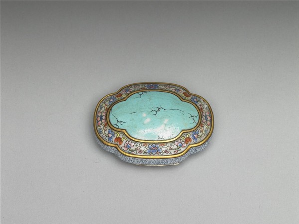 瓷製帶板,全器呈橢圓四瓣花形,兩邊微微突出。正面中央帶一橢圓形開光,內施淺藍釉為地,並以黑彩描繪裂紋。開光外緣為白地寬弦紋,繪有藍、紅、粉紅各色花葉紋,弦紋周邊塗敷金彩。器身側邊為白地,並滿繪藍色花葉紋。器背帶圓形與橢圓形鈕各一,光素無紋。