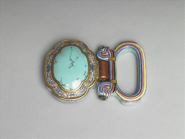 瓷製帶板,全器呈橢圓四瓣花形,兩邊微微突出。正面中央帶一橢圓形開光,內施淺藍釉為地,並以黑彩描繪裂紋。開光外緣為白地寬弦紋,繪有藍、紅、粉紅各色花葉紋,弦紋周邊塗敷金彩。器身側邊為白地,並滿繪藍色花葉紋。帶板一側接一中空長管,以橫貫而過的金屬長釘連接一橢圓瓷環。環身表面滿繪紅、黃、藍各色條紋。紅色管身描繪銀色花葉紋。器背略凹陷,中央帶一長方框,光素無紋。