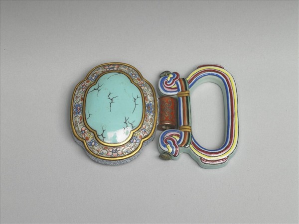 瓷製帶板,全器呈橢圓四瓣花形,兩邊微微突出。正面中央帶一橢圓形開光,內施淺藍釉為地,並以黑彩描繪裂紋。開光外緣為白地寬弦紋,繪有藍、紅、粉紅各色花葉紋,弦紋周邊塗敷金彩。器身側邊為白地,並滿繪藍色花葉紋。帶板一側接一中空長管,以橫貫而過的金屬長釘連接一橢圓瓷環。環身表面滿繪紅、黃、藍各色條紋。紅色管身滿繪銀色花葉紋。器背略凹陷,中央帶一長方框,光素無紋。