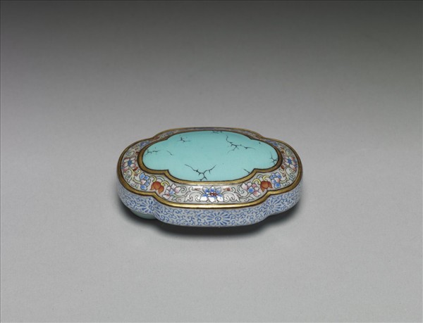 瓷製帶板,全器呈橢圓四瓣花形,兩邊微微突出。正面中央帶一橢圓形開光,內施淺藍釉為地,並以黑彩描繪裂紋。開光外緣為白地寬弦紋,繪有藍、紅、粉紅各色花葉紋,弦紋周邊塗敷金彩。器身側邊為白地,並滿繪藍色花葉紋。器背施淺藍色釉,帶圓形與橢圓形鈕各一,光素無紋。