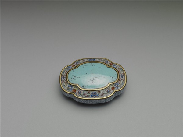 瓷製帶板,全器呈橢圓四瓣花形,兩邊微微突出。正面中央帶一橢圓形開光,內施淺藍釉為地,並以黑彩描繪裂紋。開光外緣為白地寬弦紋,繪有藍、紅、粉紅各色花葉紋,弦紋周邊塗敷金彩。器身側邊為白地,並滿繪藍色花葉紋。器背施淺藍色釉,帶圓形與橢圓形鈕各一,光素無紋。